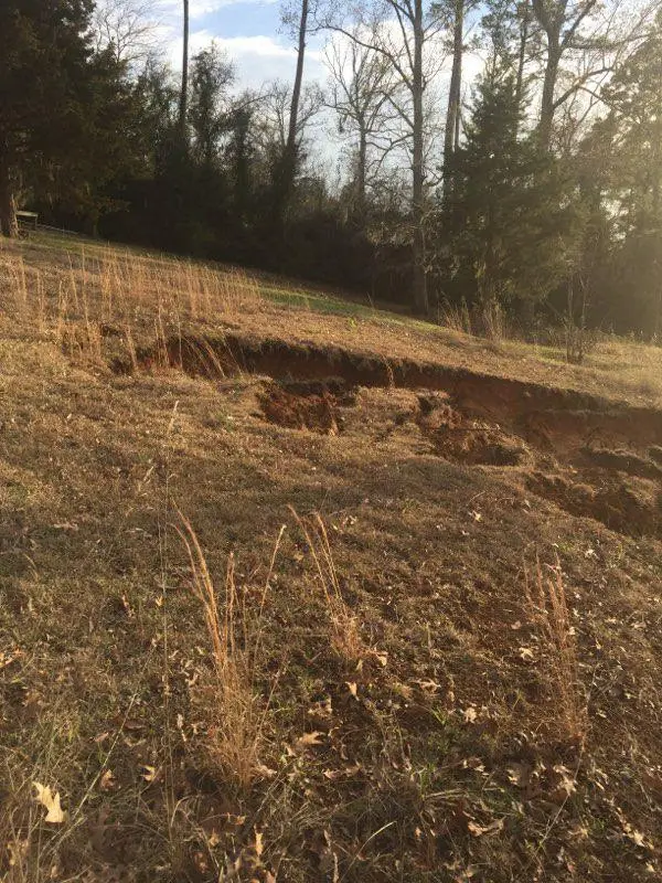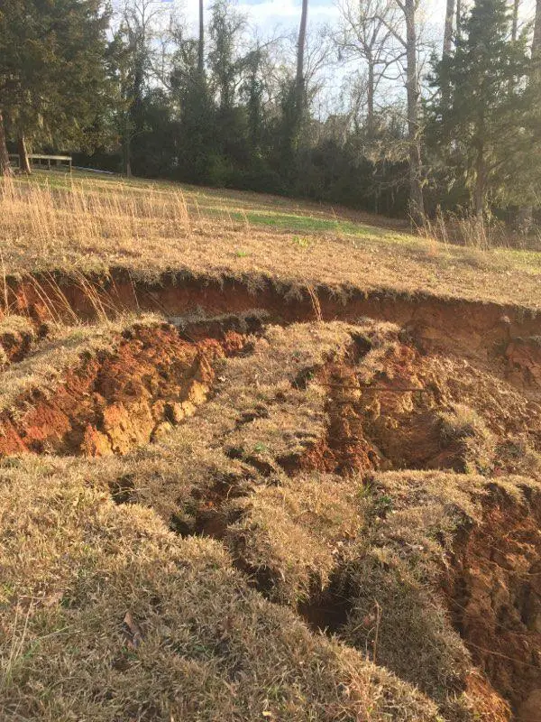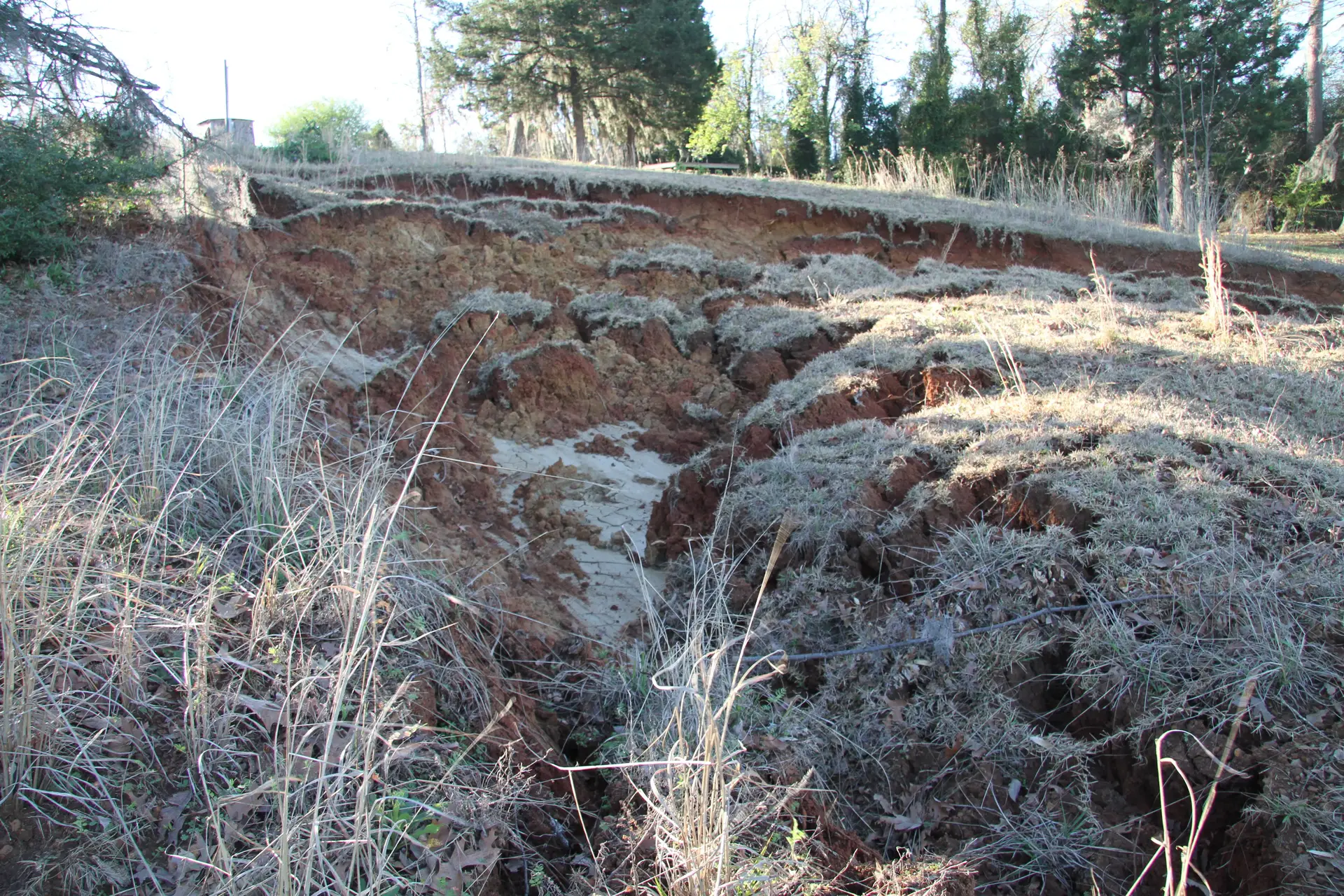 On March 3, 2018 I was able to travel to my property and get some pictures of my own. Upon my arrival I discovered that the breach was about 50 feet wide and about 75 feet into my property. I stood ont he edge of the cracks and observed that this thickness of the part that slipped is about 3 to 4 feet. The entire piece of land lost grip and slipped as if it were sliding on one of those vinyl slip n’ slides. The slip interface was at the exact point where the red clay turns into a grey fatty clay. In my opinion when the dirt was put there circa 2010 it should have been churned with the existing dirt to disrupt this interface. When the seawall was built circa 2010 the backfill dirt was dug out of the lake bed because the level was dropped that year. This backfill dirt is what slipped on the red clay / fatty grey clay interface.