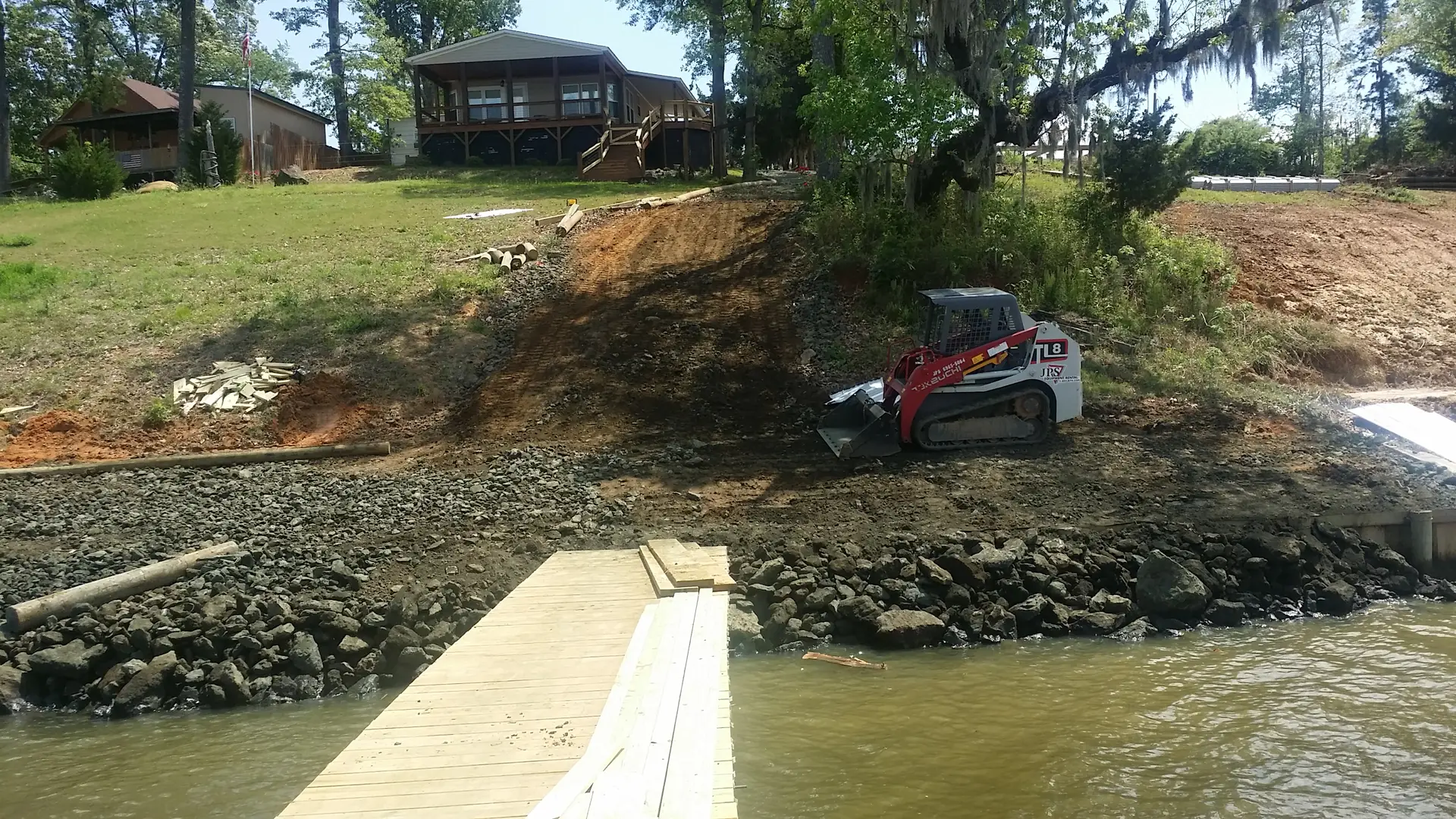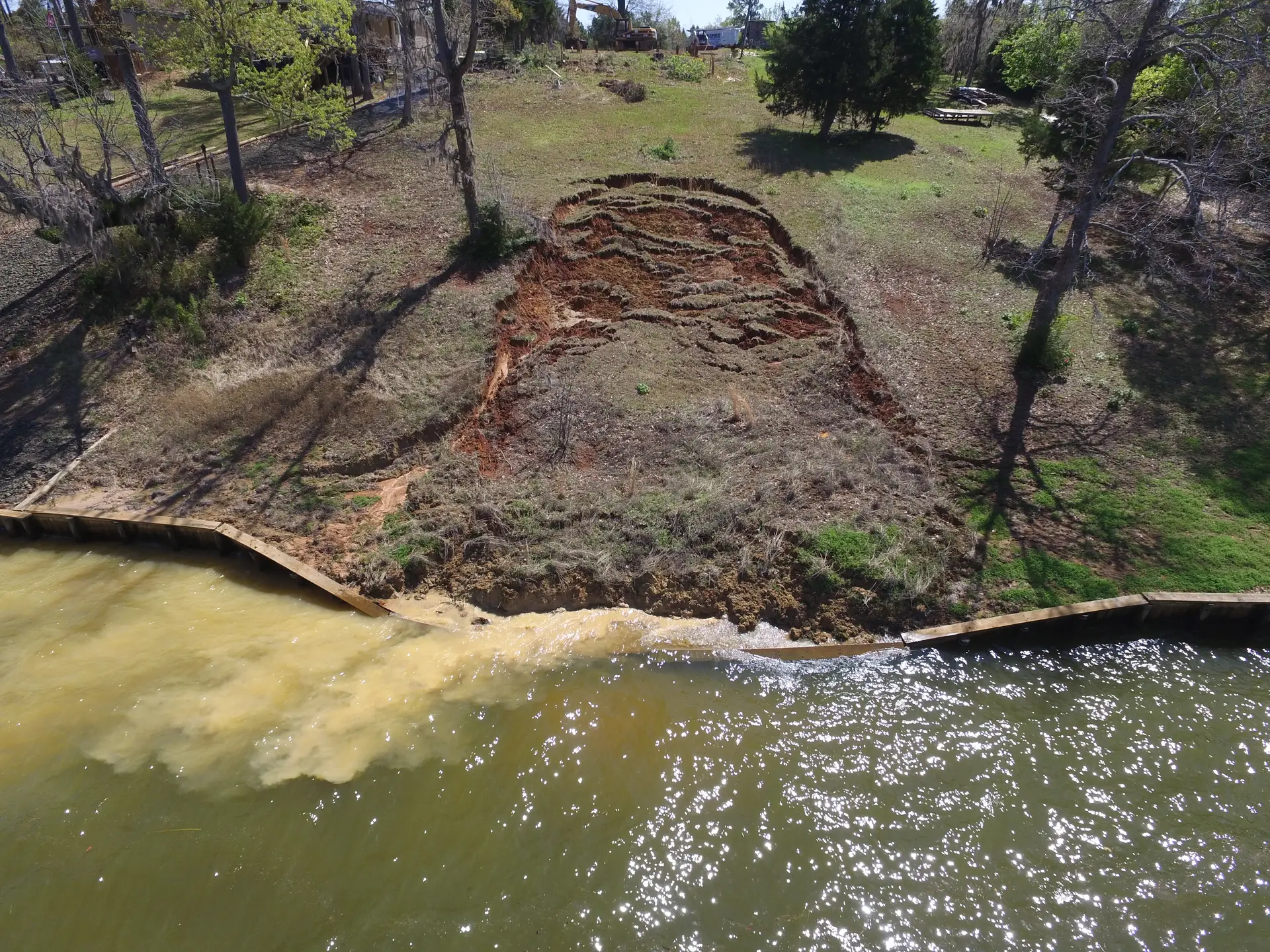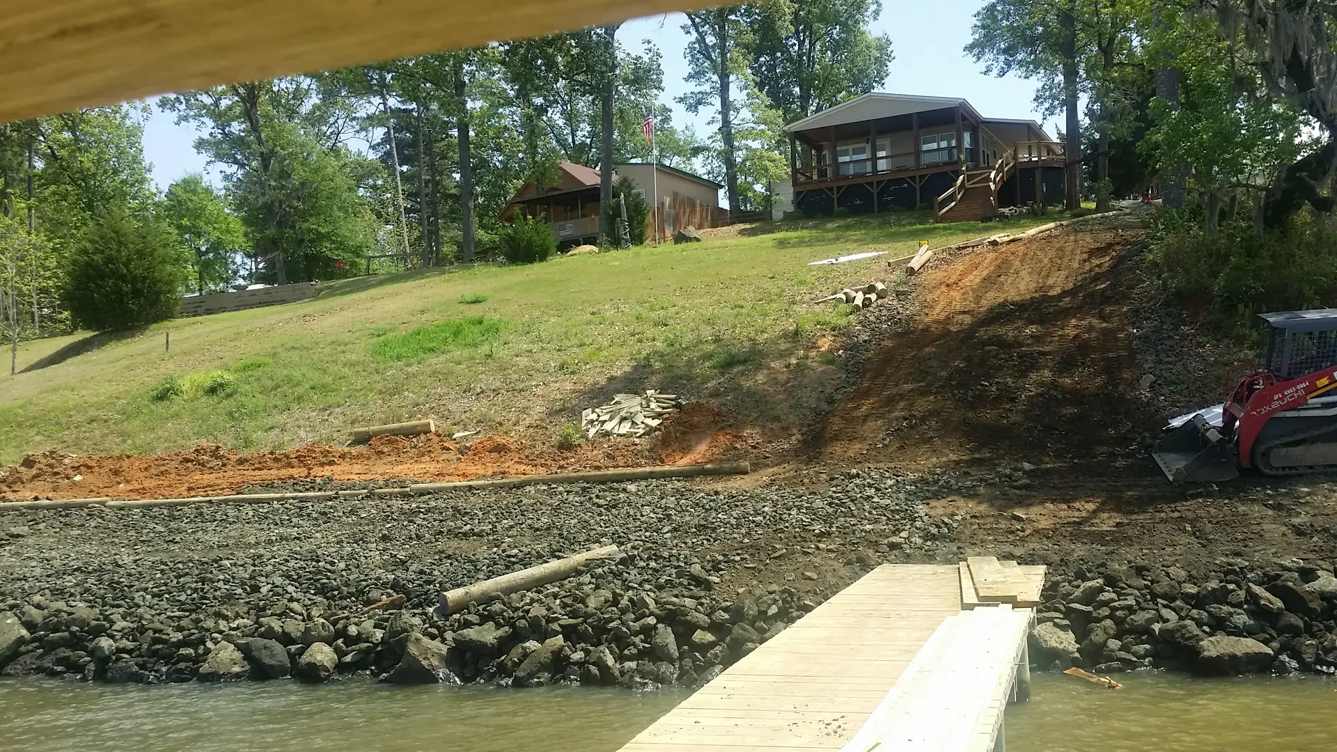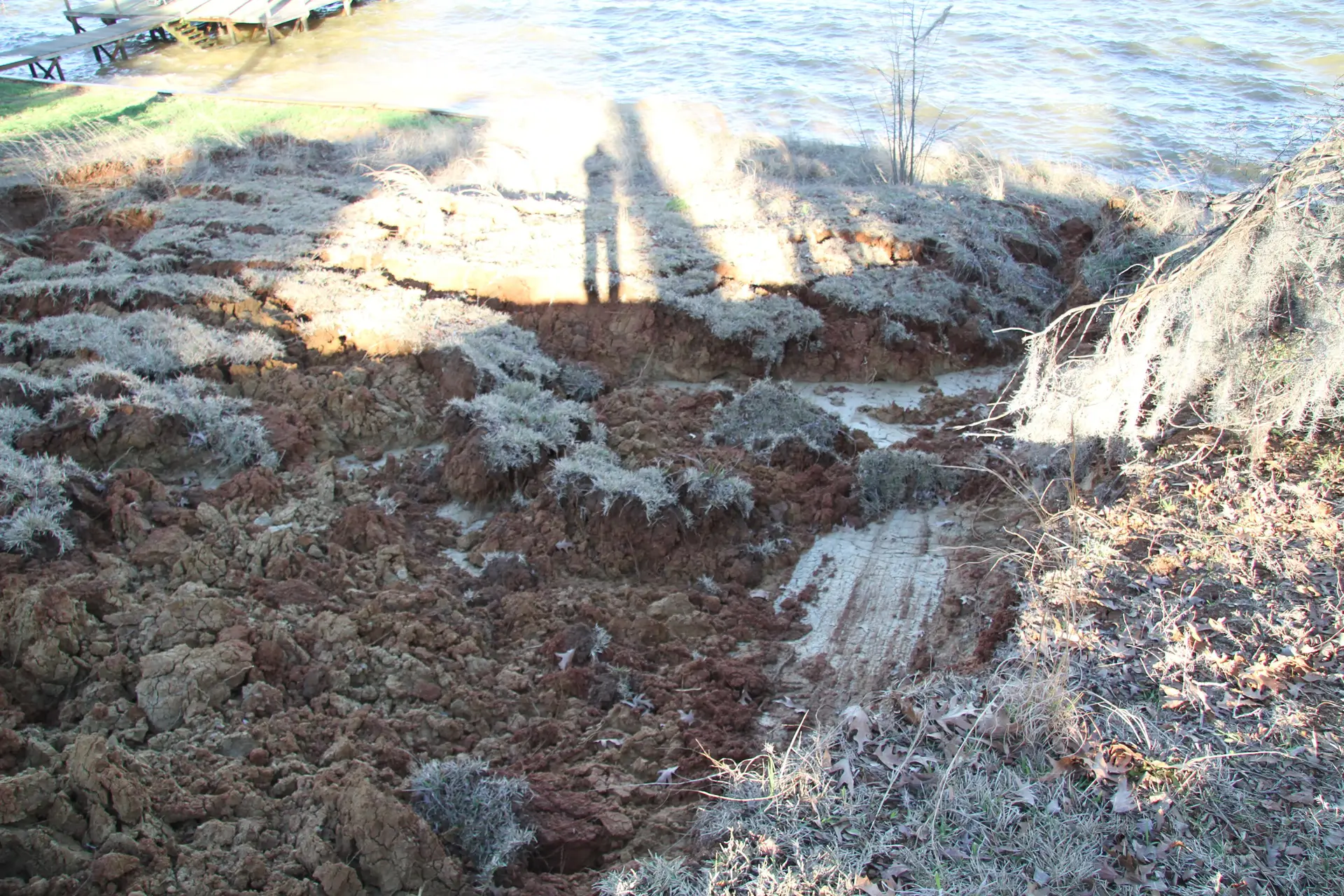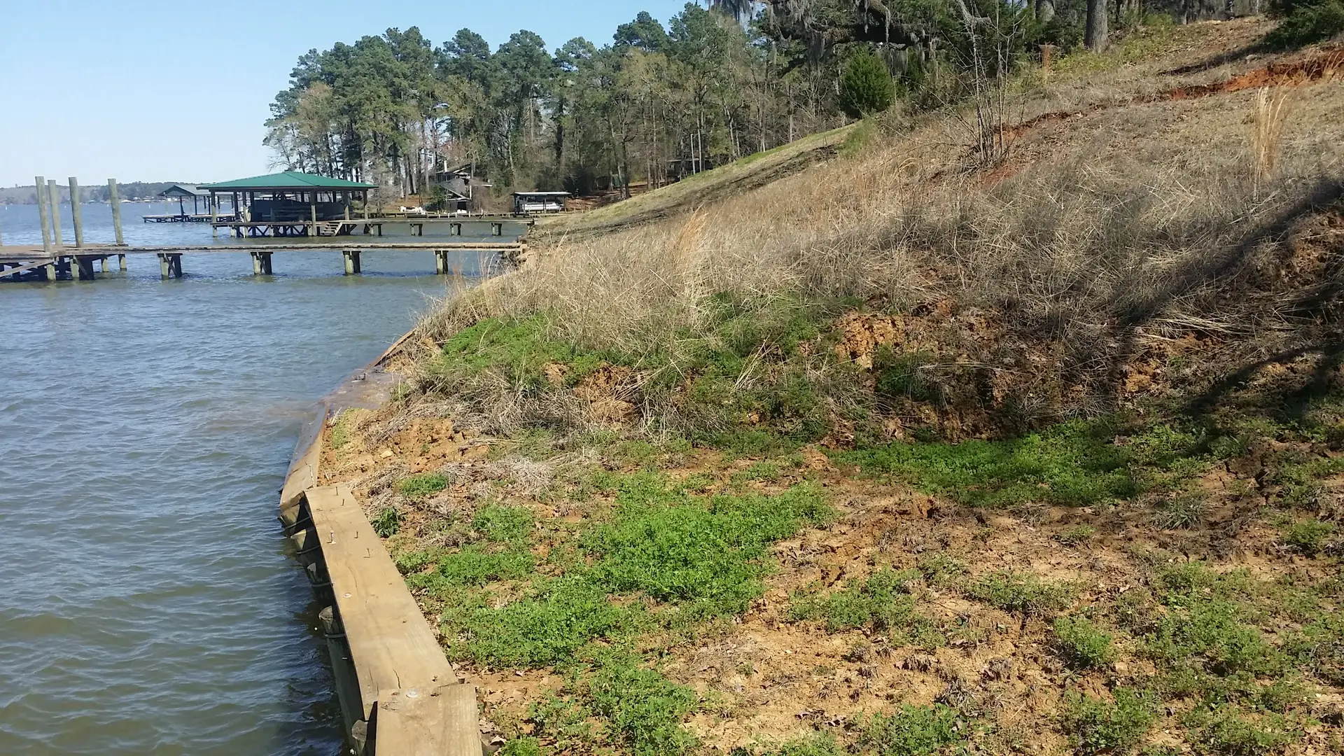 Now check out his seawall after the storm we had the other night. His rip rap is nearly all gone! When installing a rip rap seawall the base of your rocks should be three times the height, on a flat surface. The surface under the water at our seawall is sloped so agressively that I don’t even recommend using rip rap as a barrier. Next time someone starts telling you how great rip rap is, ask them if the barrier surface is flat or sloped. The only rip rap I see holding up on Toledo Bend is on flat or very gently sloping surfaces.