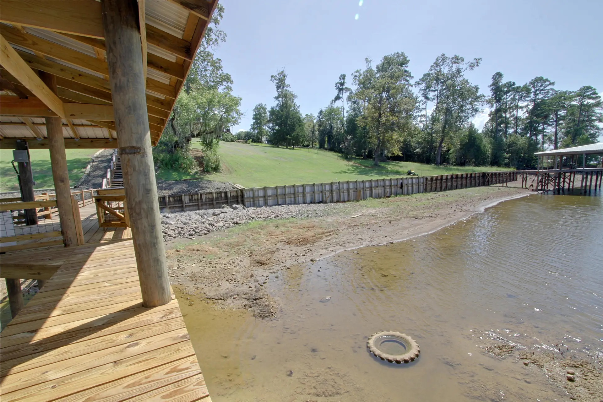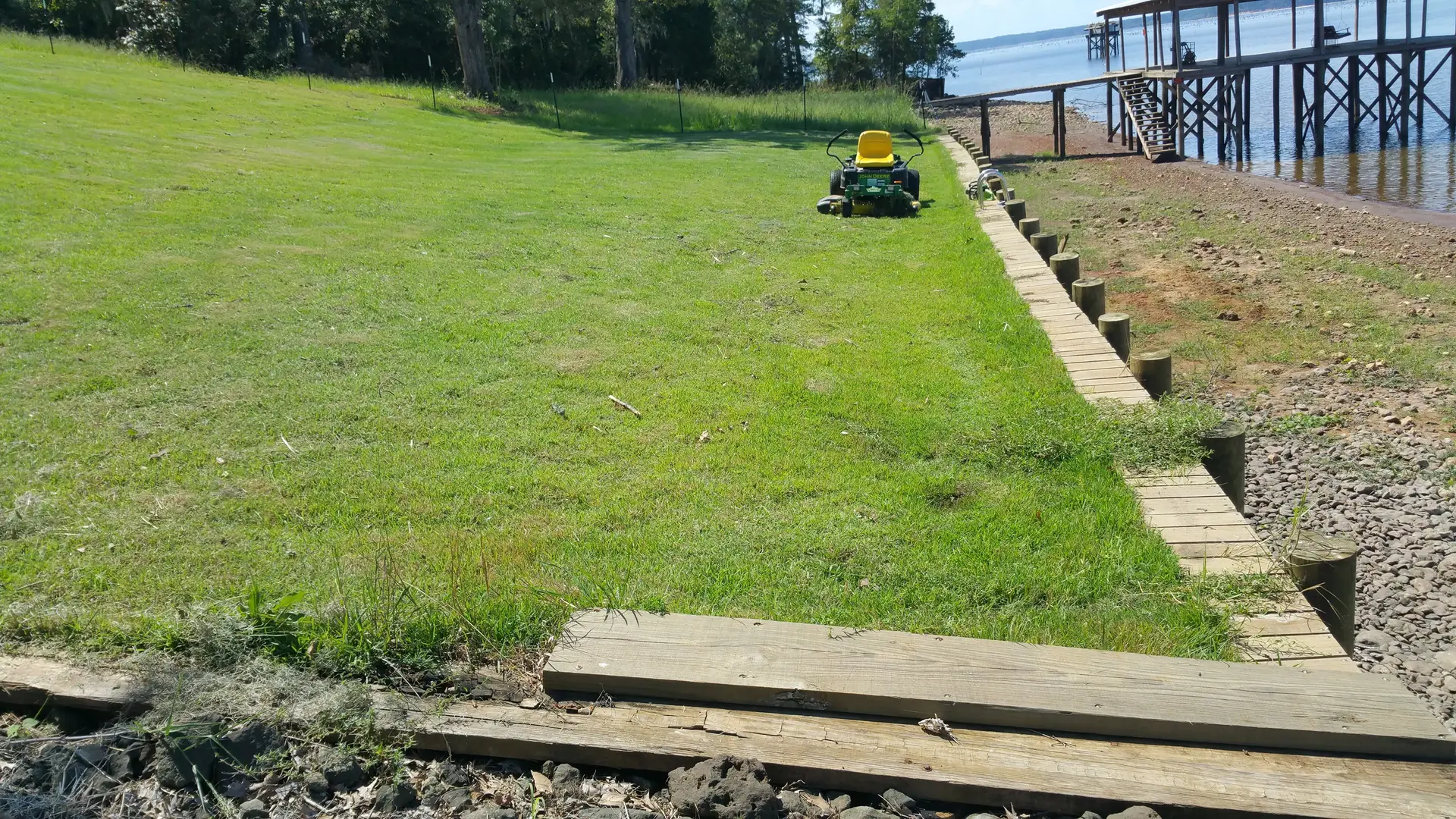 September 26, 2019 update. It’s been almost a year and a half since the new seawall was built. During this year I have concentrated on keeping the soil at the top of the seawall level with the cap board. This allows water to run over the top of the seawall instead of behind it. I’ve also planted grass and have allowed it to grow long and eventually grow over the top of the seawall. During the latter part of the summer the Sabine River Authority (SRA) lowered the lake level so they could work on the dam. This also gives owners a chance to working on things like their seawall. I took the opportunity to get some fresh pictures and video from the part of my seawall facing the lakeside.
