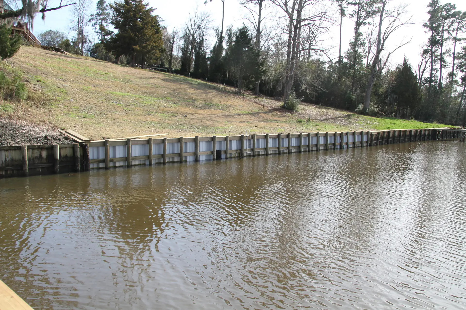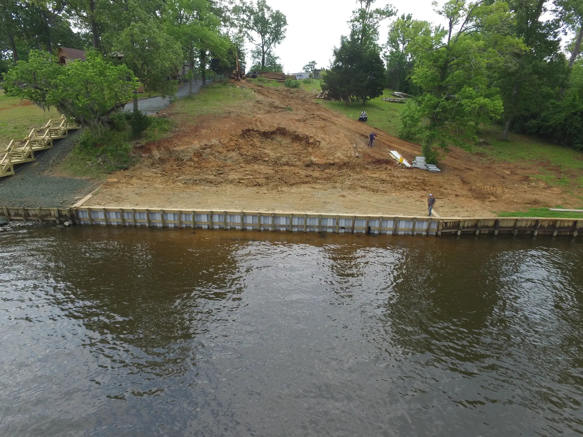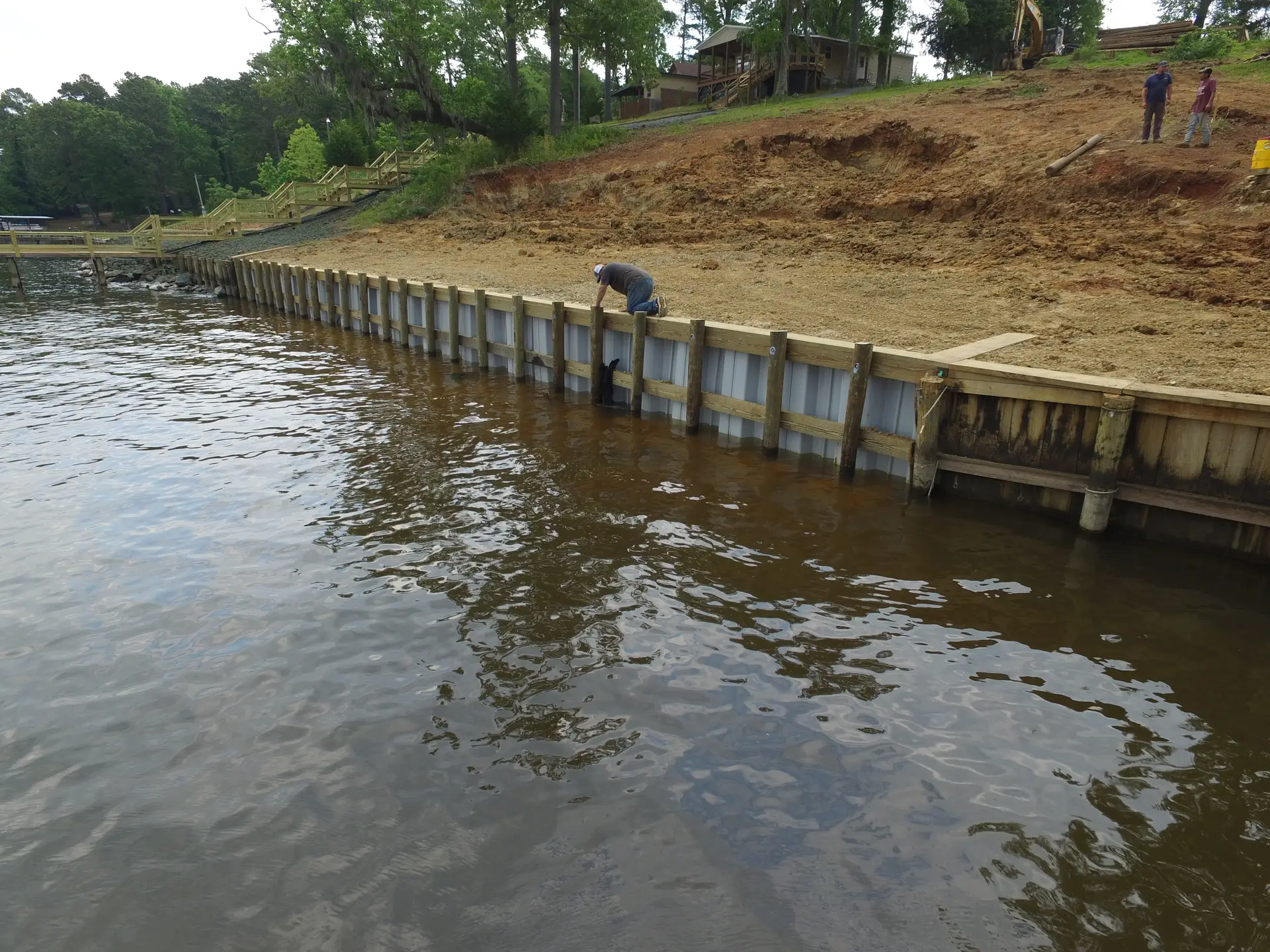 Build a vinyl seawall – Rebuilding by building a vinyl seawall on my Toledo Bend property is ultimately the option I chose. One of my neighbors advised me against this stating that vinyl seawalls are prone to buckle or crack with time. I concur with what my neighbor says about this because I’ve seen vinyl seawalls first hand that were damaged just like she describes. I discussed this with my contractor and he was familar with vinyl seawall failures due to cracks and buckling. He stated that this is because people choose too thin of vinyl and do not build the seawall in a navy style configuration as recommended by the vinyl manufacturer. Below is a boilerplate drawing of a navy style seawall and an example of a navy style seawall in service.