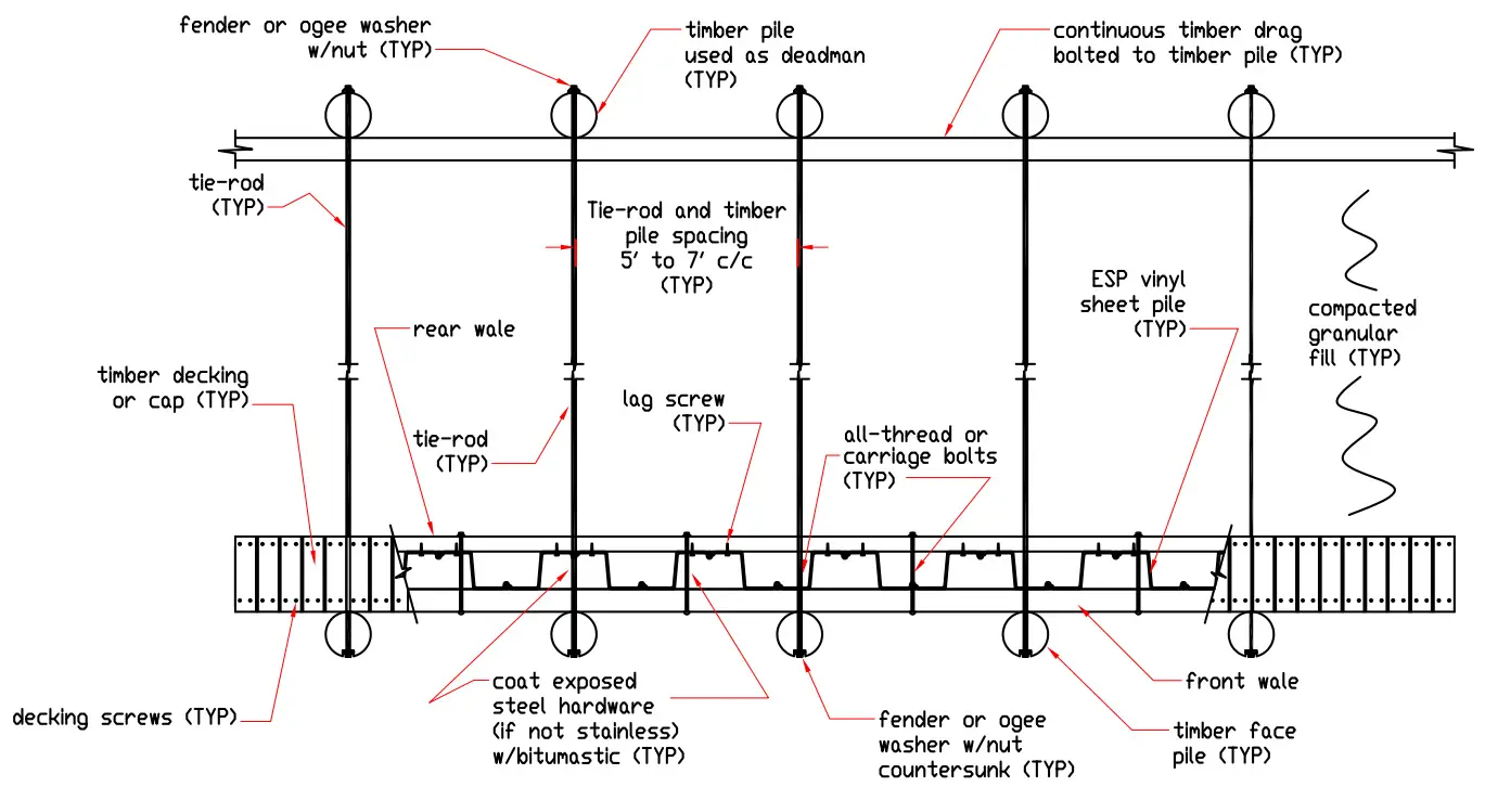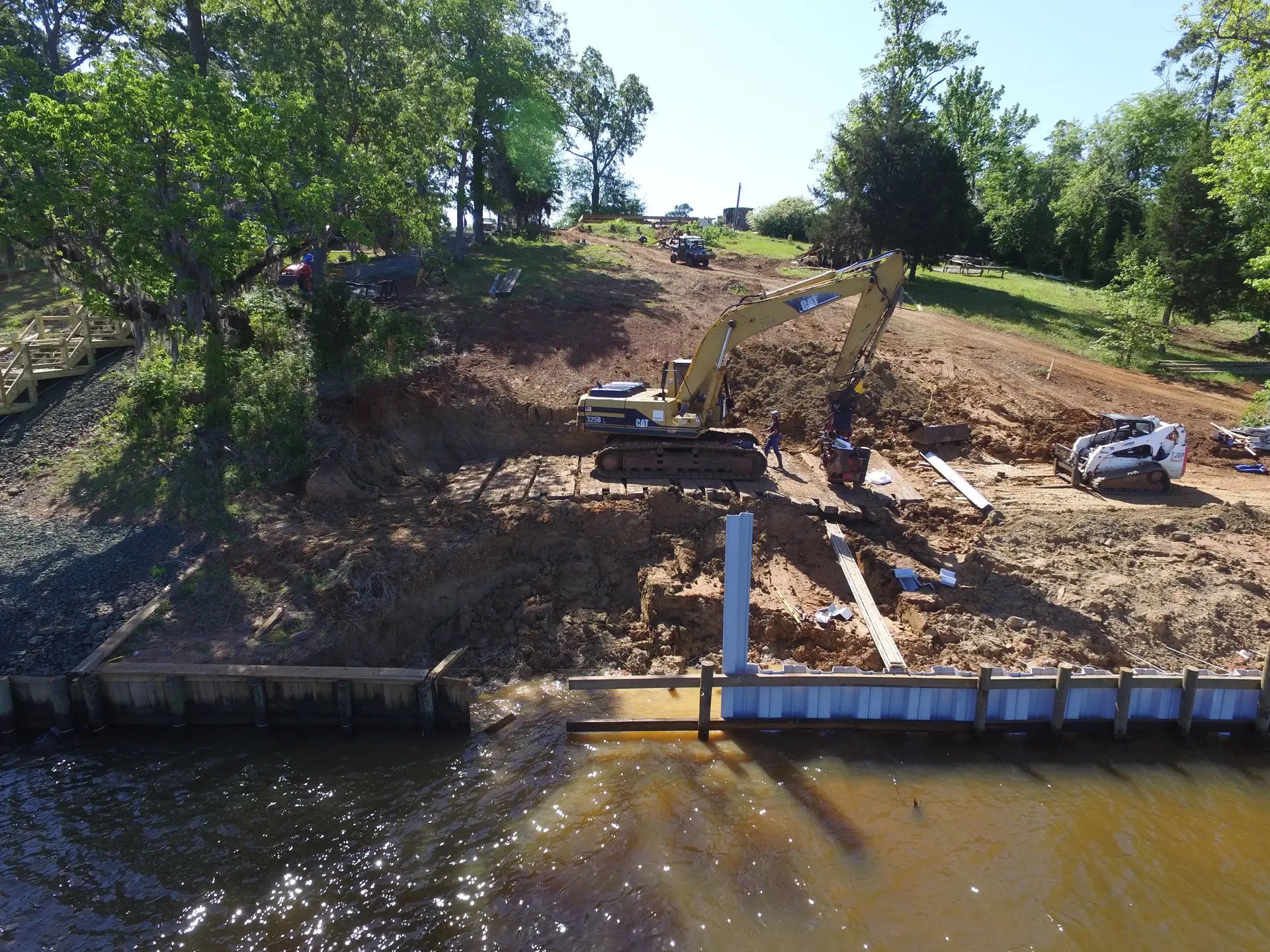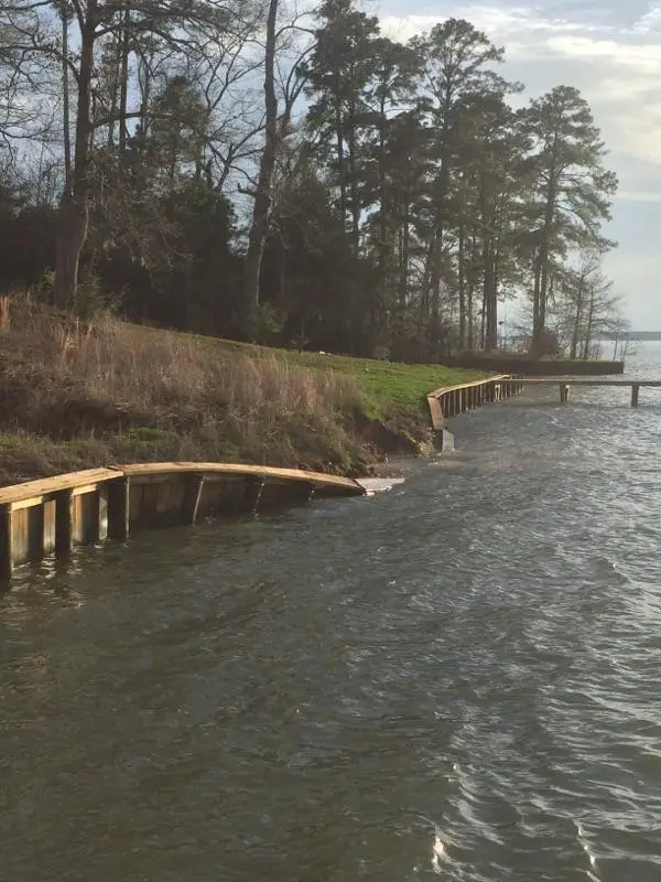 Build a vinyl seawall – Rebuilding by building a vinyl seawall on my Toledo Bend property is ultimately the option I chose. One of my neighbors advised me against this stating that vinyl seawalls are prone to buckle or crack with time. I concur with what my neighbor says about this because I’ve seen vinyl seawalls first hand that were damaged just like she describes. I discussed this with my contractor and he was familar with vinyl seawall failures due to cracks and buckling. He stated that this is because people choose too thin of vinyl and do not build the seawall in a navy style configuration as recommended by the vinyl manufacturer. Below is a boilerplate drawing of a navy style seawall and an example of a navy style seawall in service.