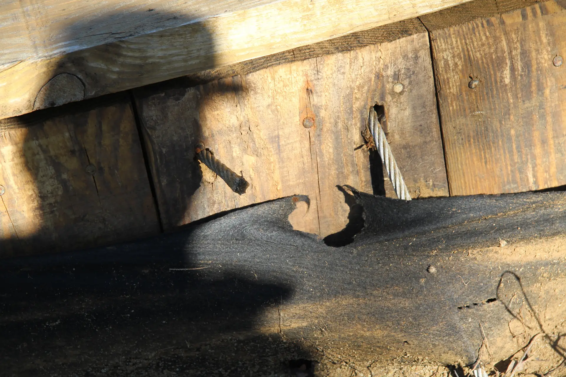 I left the property and returned on March 7, 2018. Before returning I spoke with an Architect, a Geotechnical lab, and a pile driving company who specializes in building seawalls. All three were of the same opinion that the recent rains triggered the event, which is likely a weak spot in the seawall. Upon my return on March 7 I looked for clues. I didn’t find just clues, but I found answers. Seawalls consist of pilings driven into the ground with a wall driven behind them. To help support the seawall a second set of pilings are located 10 to 20 feet behind the wall and driven into the dry ground. Tension cables that stretch from the front pilings to the back pilings are used to make the two sets of pilings work as a system. The tension in the cables is vital to the performance of the entire seawall system. Here is a picture that shows what I’m talking about with the two sets of pilings connected with cables. The image you see here are what it looks like just before the cables are tightened and held with fasteners. Once the cables are tight all of it is covered in backfill dirt.