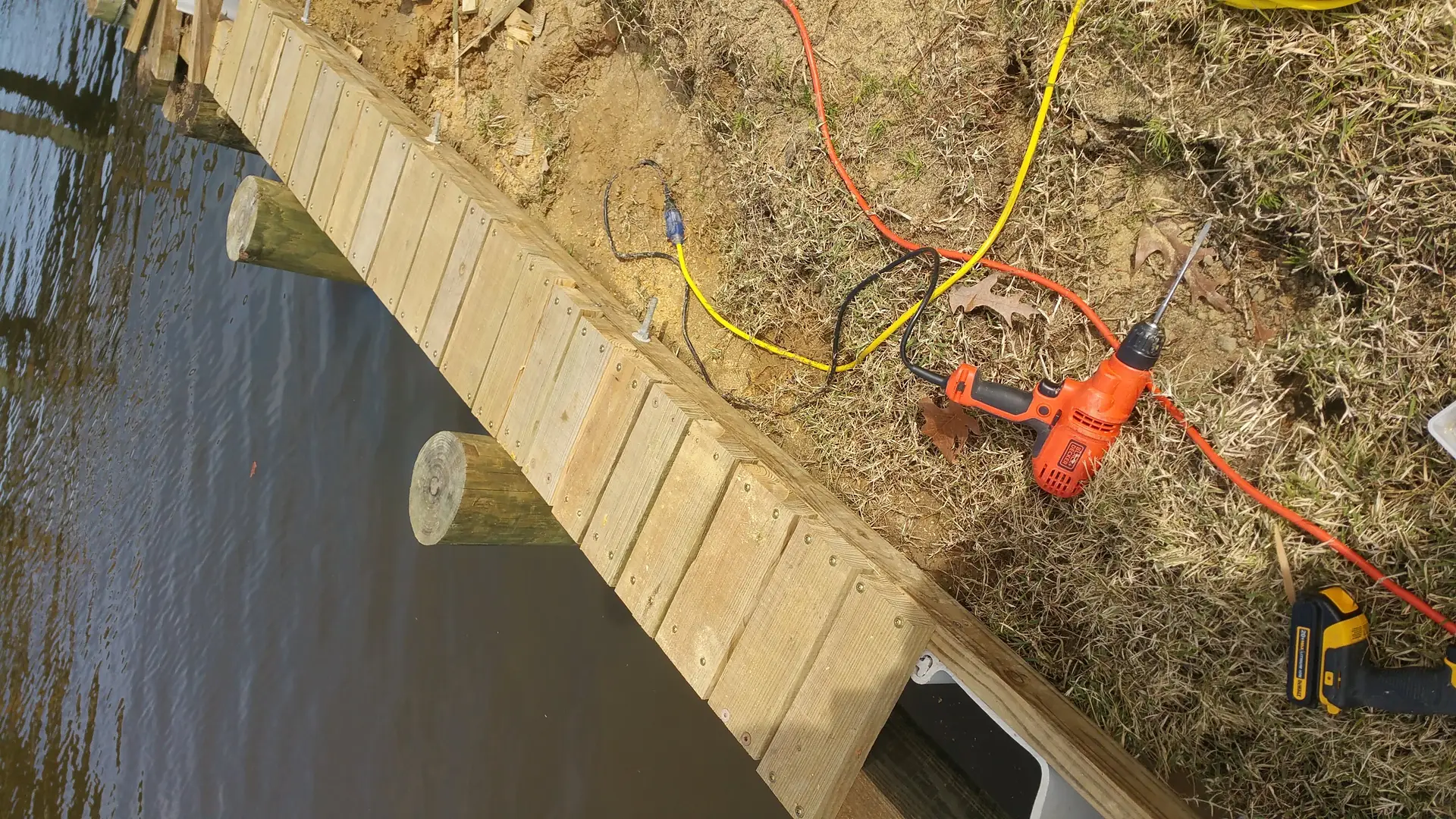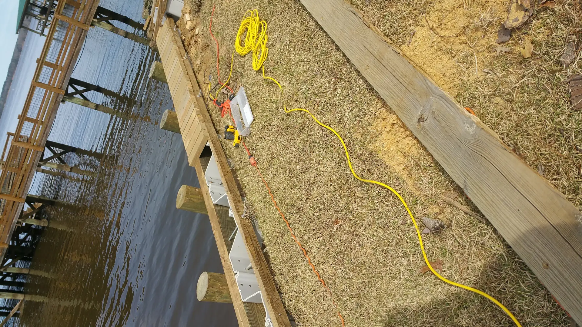 As you can see my neighbor’s seawall still has a lean to it. The seawall pilings are so short that standing it up any more could cause damage. As a courtesy we installed tieback reinforcements on two of her pilings. Protection for my seawall and a freebie for her.