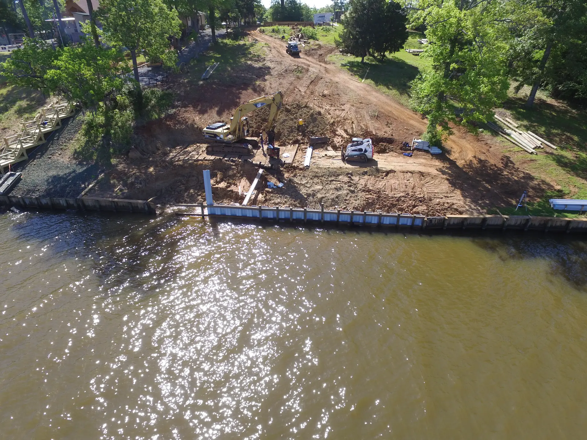 The machinery has to stay back from the seawall at least 20 feet to avoid over-packing the soil or damaging the tieback system.