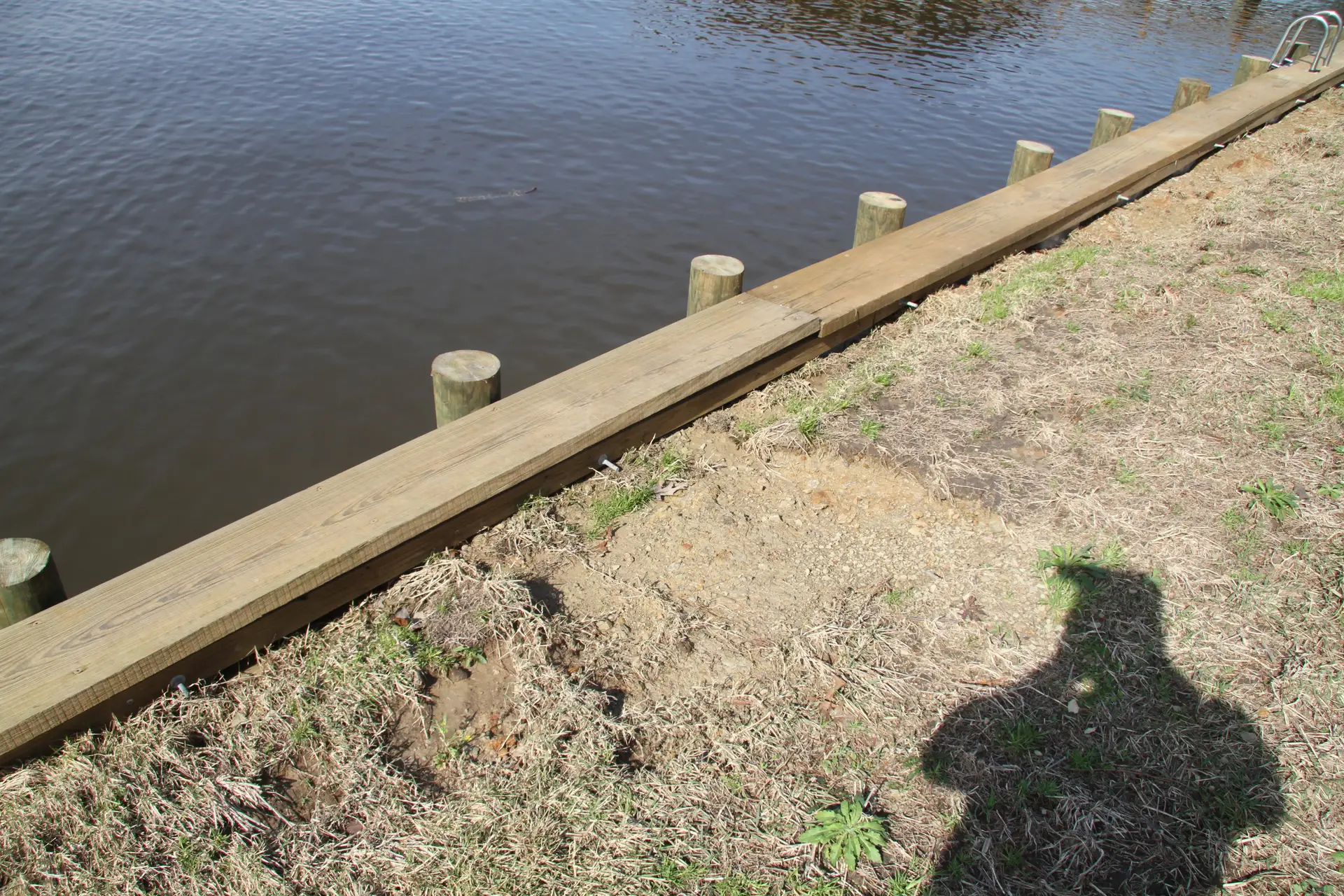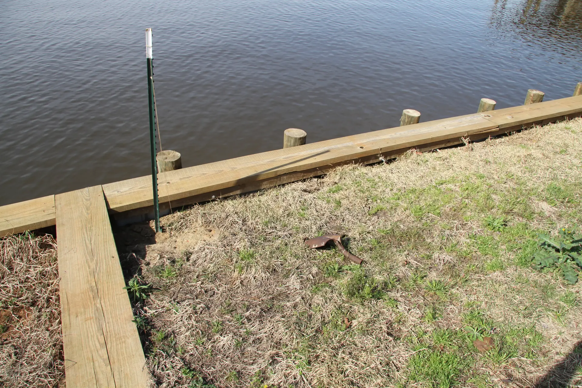 Notice how the ground is several inches below the cap? Not good! Soil and vegetation should be build up to where water can flow over the seawall and not pool up behind it.