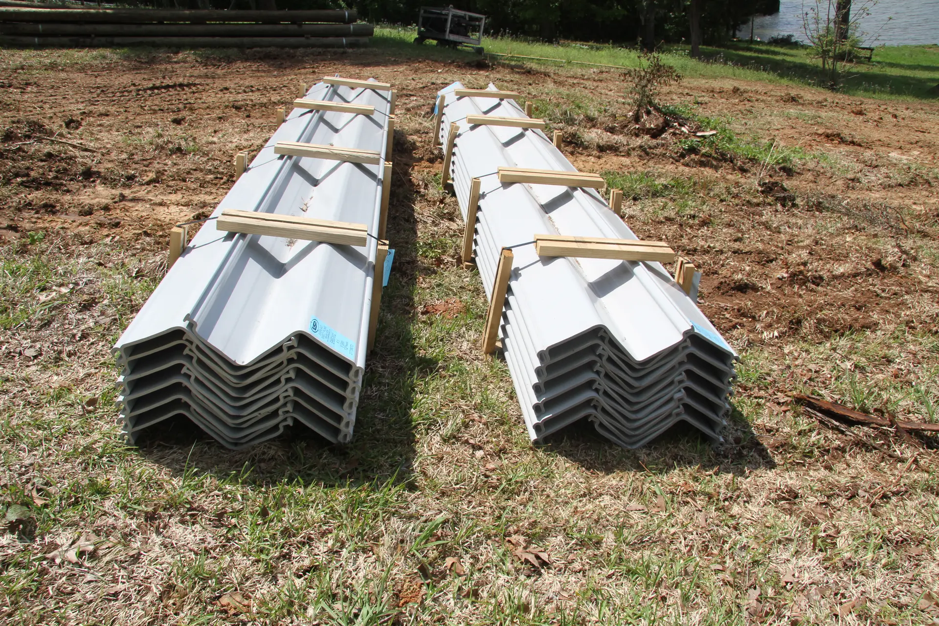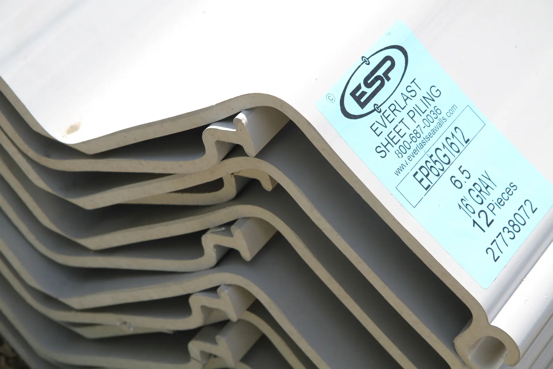 You might notice in the Boilerplate Navy Style Seawall drawing above that it does not use tension cables like my old seawall did. Instead it uses tension rods. This is a new trend in seawall technology. Even the original contractor, Ricky Hobbs, mentioned the other day that he no longer uses tension cables and instead uses tension rods.Here are some pictures of the vinyl my contractor chose for the project along with a spec sheet for this particular seawall vinyl. As you can see this is nearly 1/2 inch thick! Each sheet is 16′ long. Given that the seawall will be above the water line approximately 3′ and another 3′ down to the mud line, the vinyl will be driven to a depth of approximately 10′. The original wooden sheets were only 10′ long. This means that the original wooden sheets couldn’t have been driven more than 2 to 4 feet into the ground. Not good! The pillings in front of the vinyl are 20′ long and will be driven to 12′ or refusal. The tieback rods are made of galvanized steel, and they are 20′ long. My original pilings were only 14′ long in total length. That means that the most they could have been driven into the ground is only 5 or 6 feet. Not good!everlast Seawall Vinyl esp 6.5 spec sheet