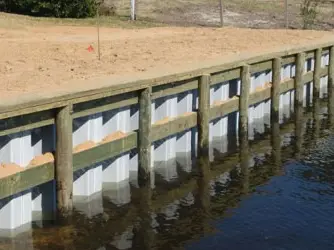 - Build a vinyl seawall - Rebuilding by building a vinyl seawall on my Toledo Bend property is ultimately the option I chose. One of my neighbors advised me against this stating that vinyl seawalls are prone to buckle or crack with time. I concur with what my neighbor says about this because I've seen vinyl seawalls first hand that were damaged just like she describes. I discussed this with my contractor and he was familar with vinyl seawall failures due to cracks and buckling. He stated that this is because people choose too thin of vinyl and do not build the seawall in a navy style configuration as recommended by the vinyl manufacturer. Below is a boilerplate drawing of a navy style seawall and an example of a navy style seawall in service.