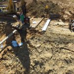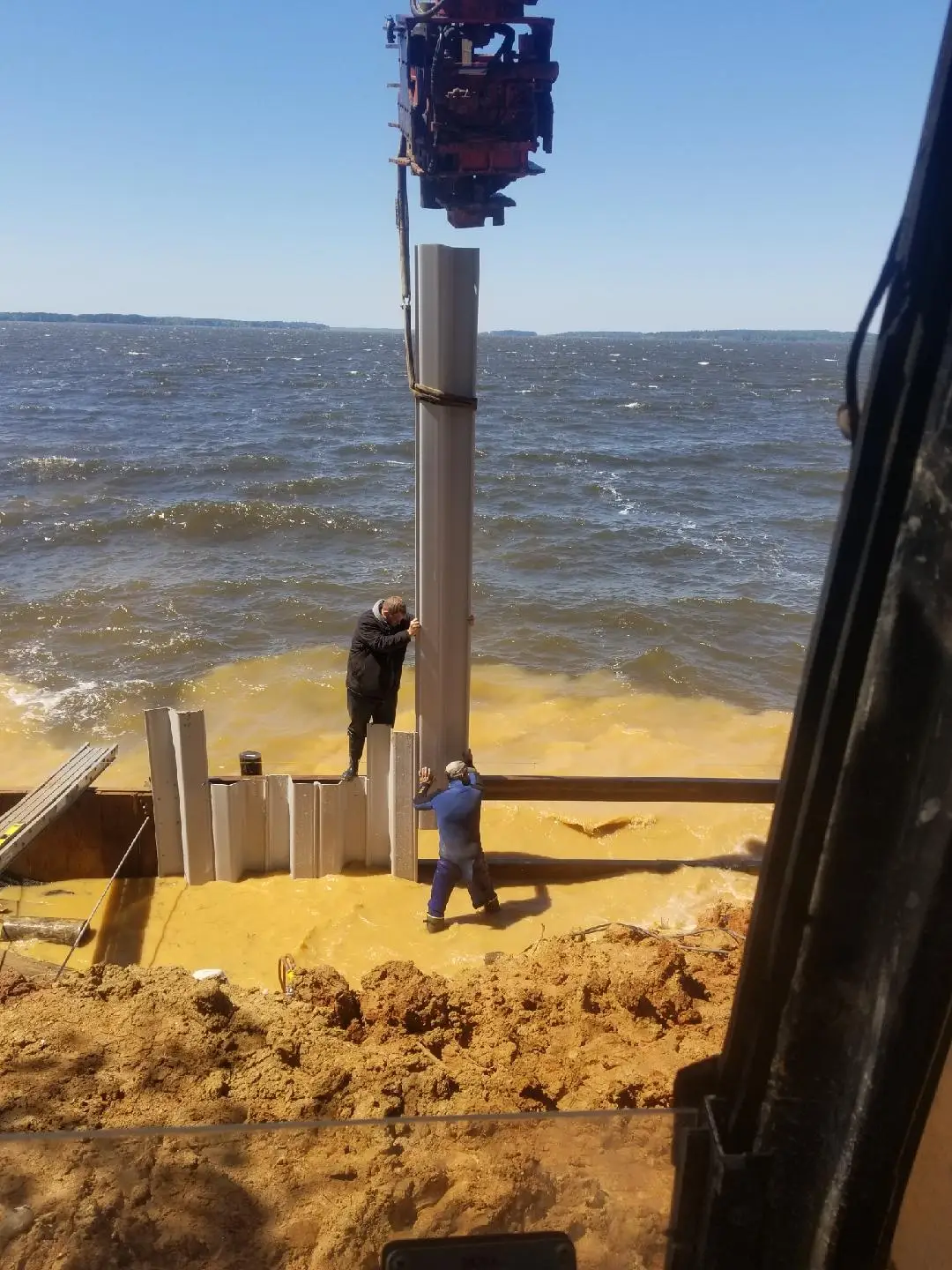 - A vinyl sheet ready to be driven by the excavator and vibratory hammer.